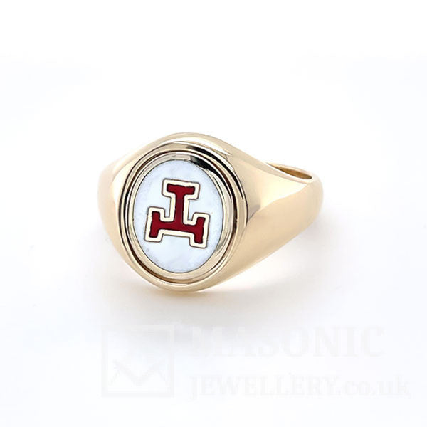 Crafted in 9ct Gold a hallmarked Triple Tau Masonic Ring with a swivel head. Featuring an Oval head in white and red vitreous enamel depicting the symbol of the Triple Tau in the centre. The reverse of the swivel is totally plain and suitable for engraving.