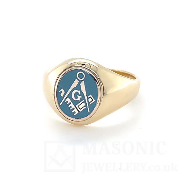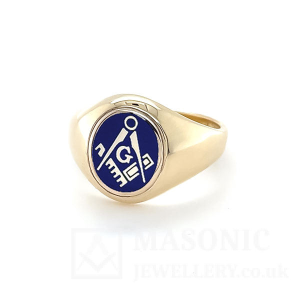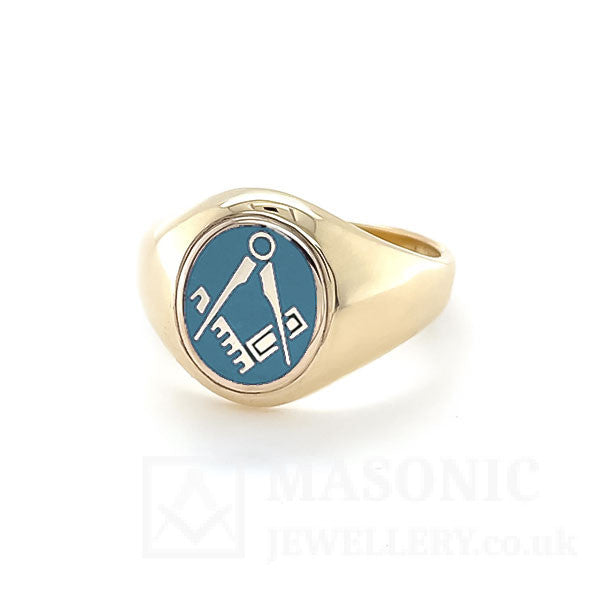 Our Gold fixed head Square and Compass Oval Head Masonic Ring features an Oval head in vitreous enamel depicting the square & compass in the centre. Our Gold Oval Head Square and Compass Masonic Ring is available in black, blue, light blue and red. We understand that this is the most recognisable emblem of Freemasonry.