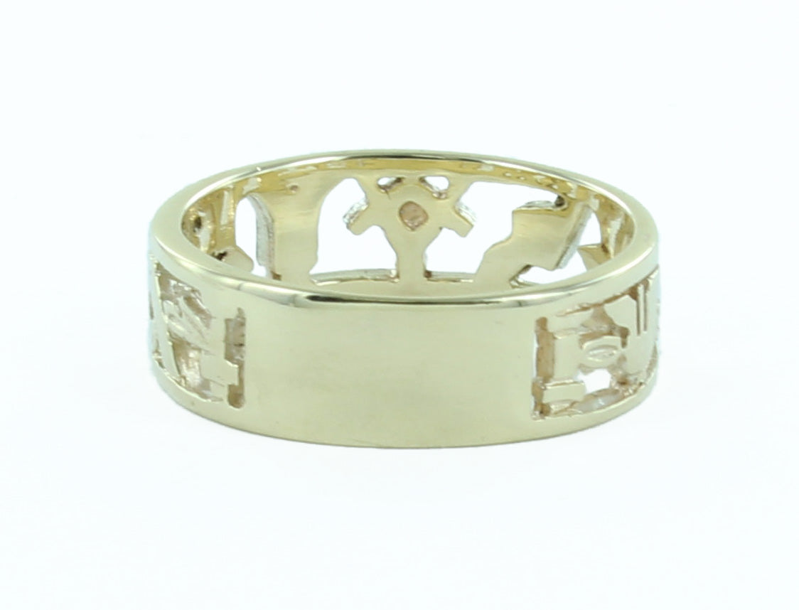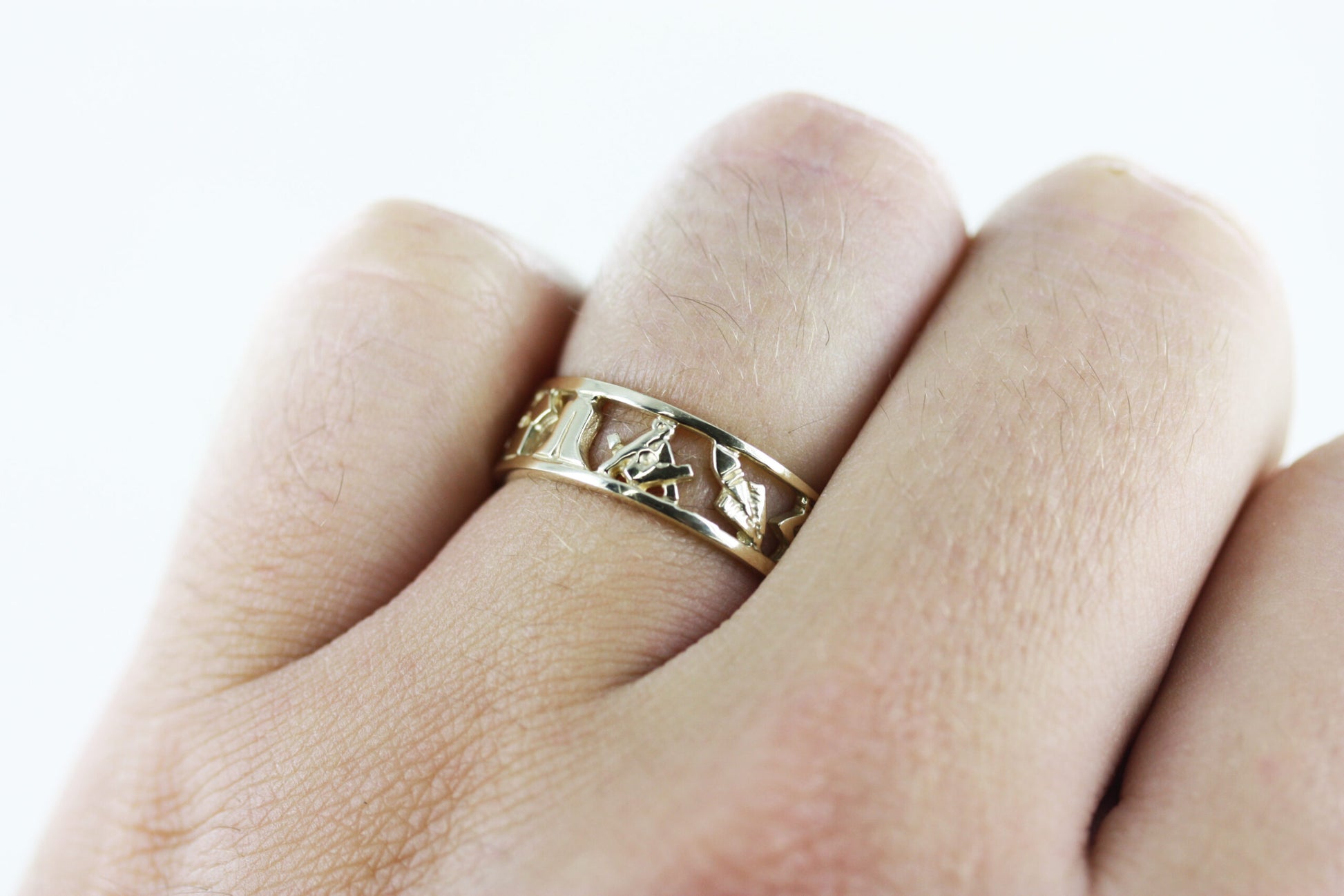 Hallmarked Solid 9ct Yellow Gold masonic (Freemason) Ring with intricate hand pierced and engraved fretwork depicting various masonic symbols.
