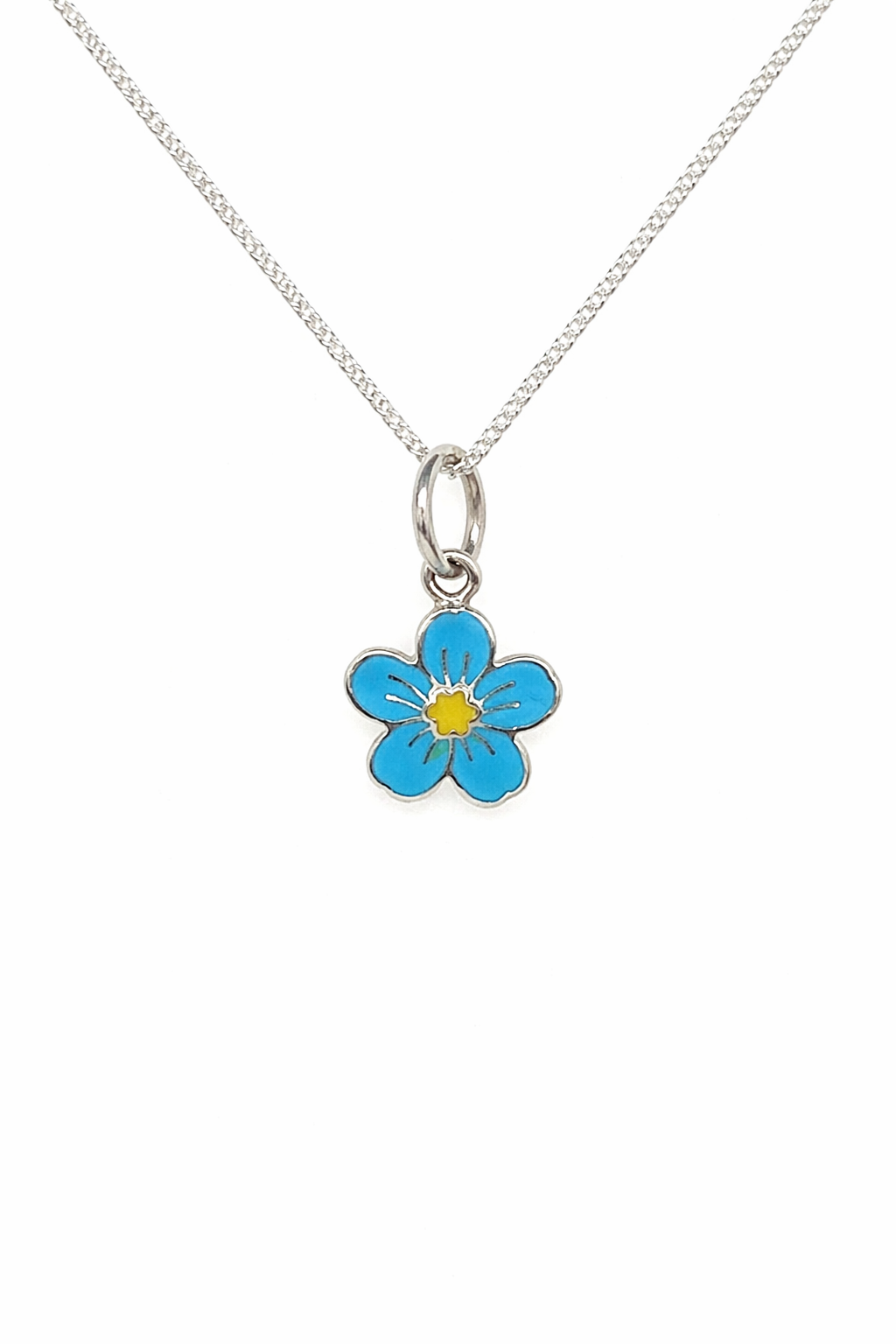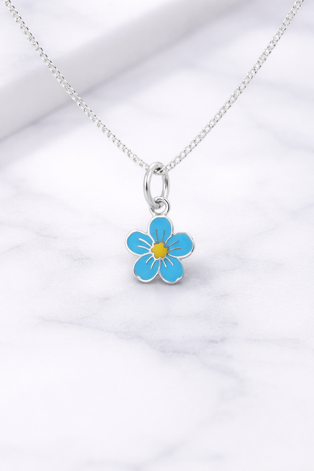 A delicate symbol of remembrance and lasting connection, this Forget-Me-Not sterling silver necklace features a beautifully detailed blue enamel flower with a vibrant yellow centre, suspended from a fine 20-inch silver chain.